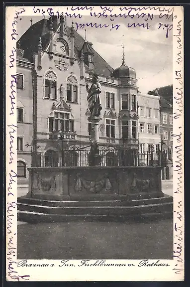 AK Braunau a. Inn, Fischlbrunnen m. Rathaus