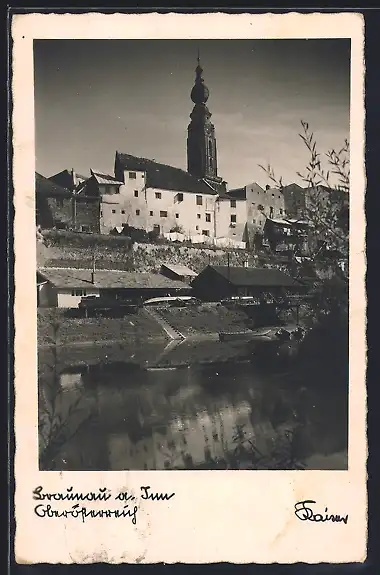 AK Braunau am Inn, Flusspartie mit Blick zur Kirche
