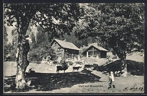 AK Braunwald, Bauernhaus mit Kühen auf der Weide