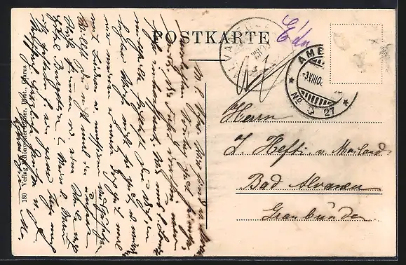gelaufen 1908, Briefmarke entfernt, Eckknick re. oben, guter Zustand