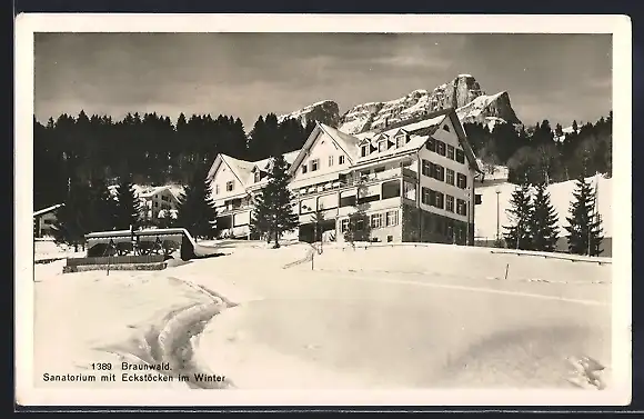 AK Braunwald, Sanatorium mit Eckstöcken im Winter