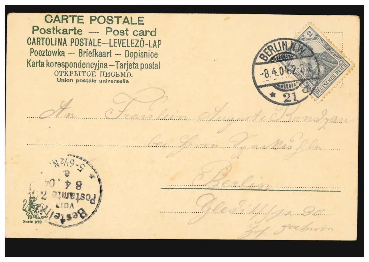 als Ortspostkarte mit Ankunftsstempel "Bestellt vom Postamte ... - 8.4.04"