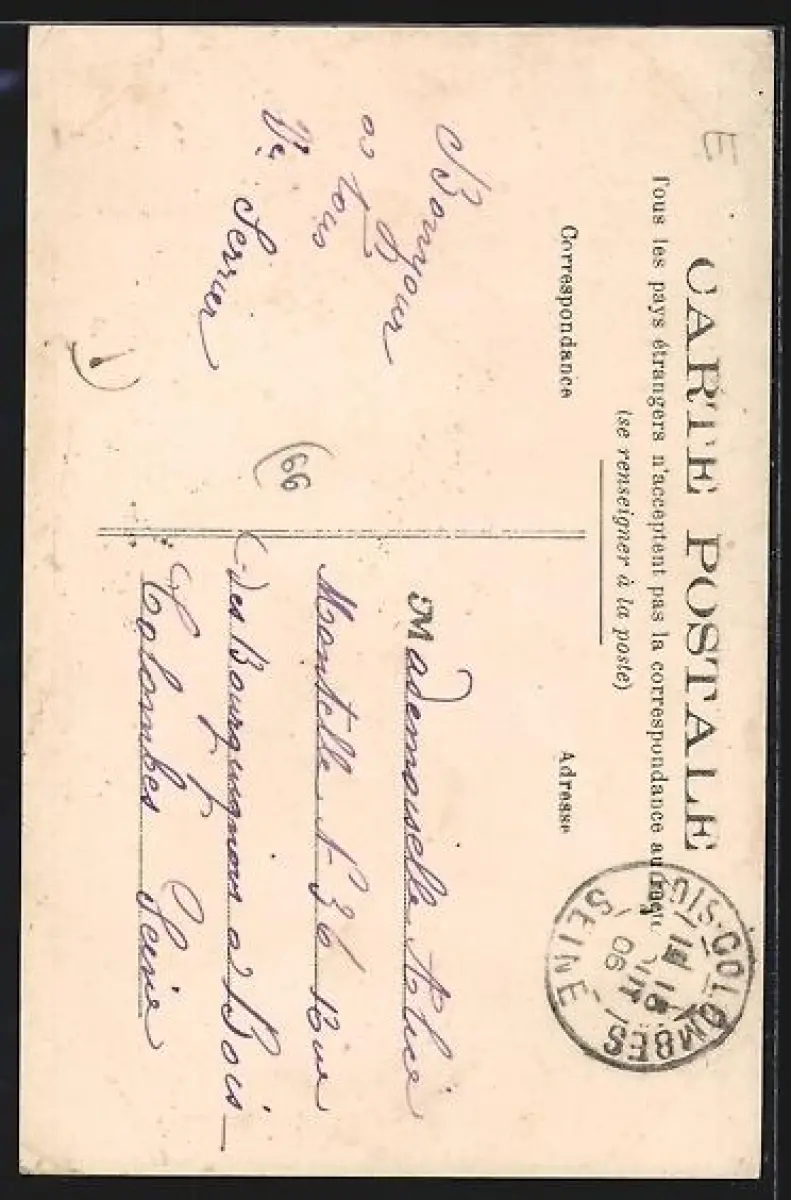 Personenbezogene Daten auf der Rückseite der Karte wurden durch blauen Textmarker unkenntlich gemacht. Die blauen Stellen sind auf die Vorderseite durchgeweicht und wirken sich negativ auf das Postkartenfoto aus