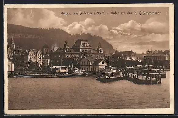 AK Bregenz a. Bodensee, Hafen mit dem K. k. Postgebäude, Dampfer