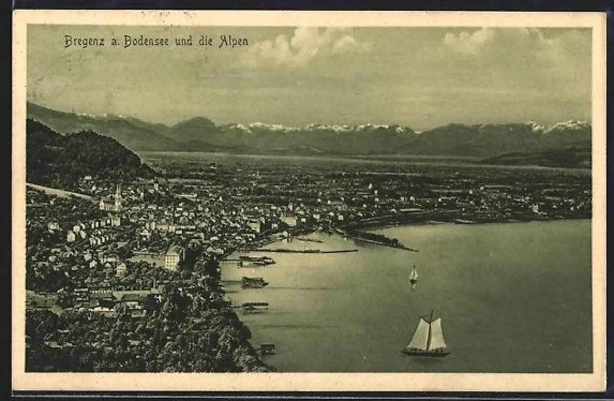 AK Bregenz a. Bodensee, Panorama mit See und Alpen