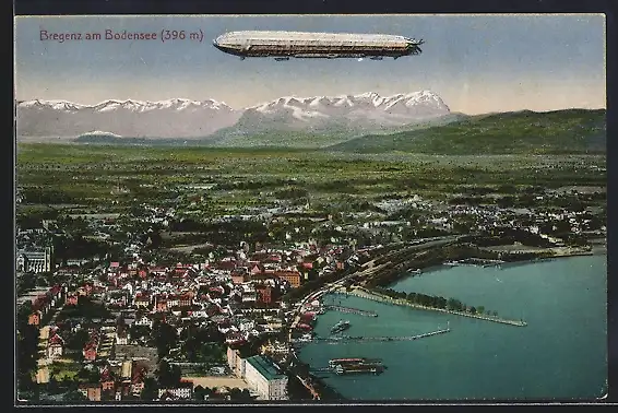 AK Bregenz am Bodensee, Zeppelin fliegt über die Stadt