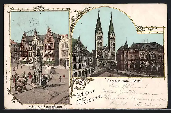 AK Bremen, Marktplatz mit Roland, Rathaus, Dom und Börse