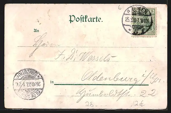 alte Ansichtskarte, gelaufen 1903, Stempelspur, guter Zustand