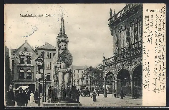 AK Bremen, Marktplatz mit Roland und Gasthaus Bodega