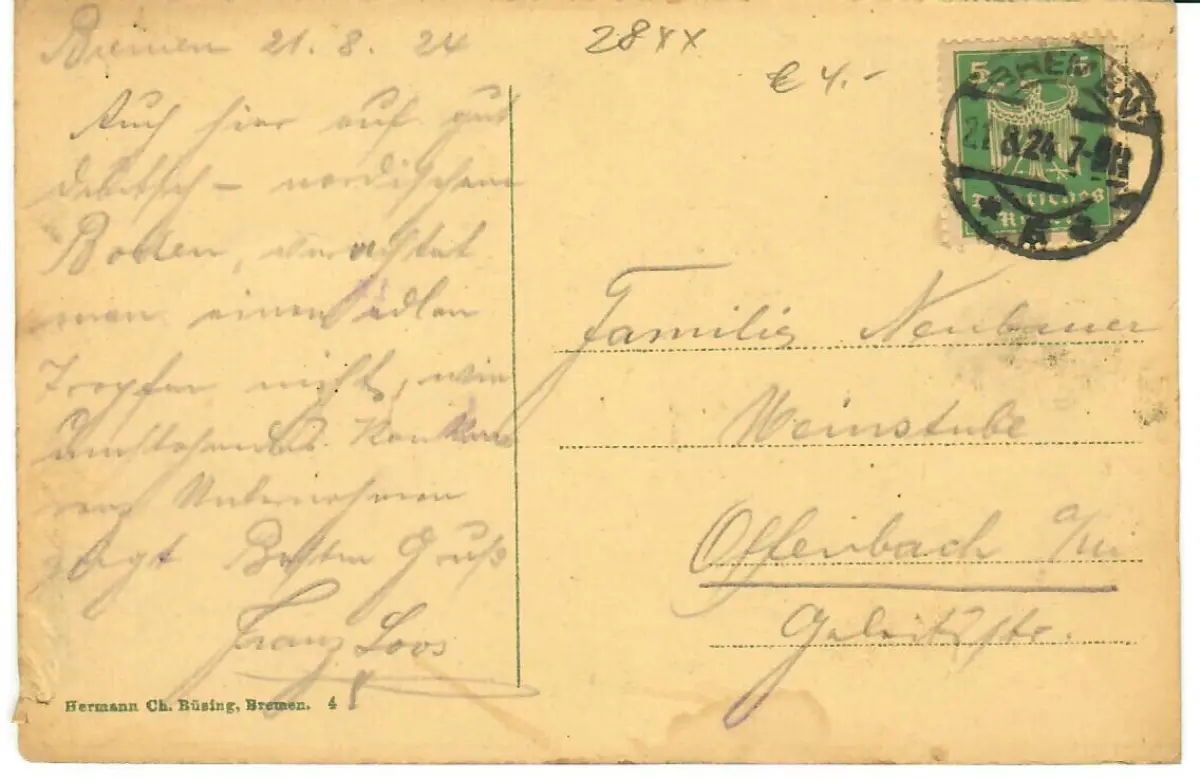 Alte Postkarte - Ansichtskarte 1924 gelaufen Erhaltungszustand: 2 - gut Alte Originale weisen durch ihr Alter Diese Zeitzeichen stellen keine Mängel dar. Bitte beachten Sie: es können leichte durch Scannen entstehen! Jede Karte wird von uns einzeln begutachtet und der Erhaltungszustand Versand- und Verpackungskosten