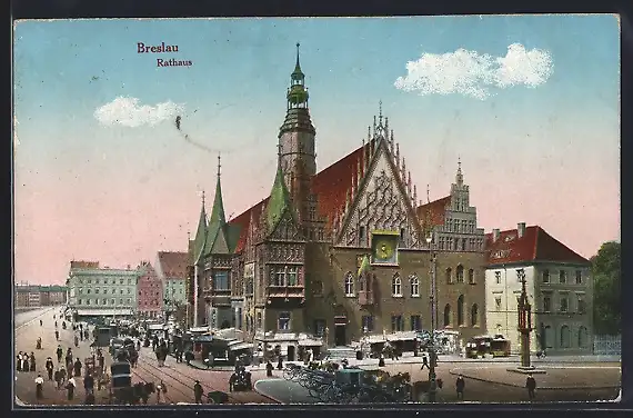 AK Breslau, Rathaus mit geschäftigem Treiben