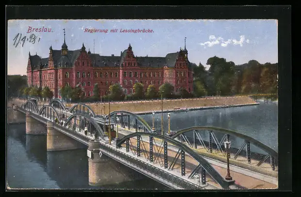 AK Breslau, Regierung mit Lessingbrücke und Strassenbahn