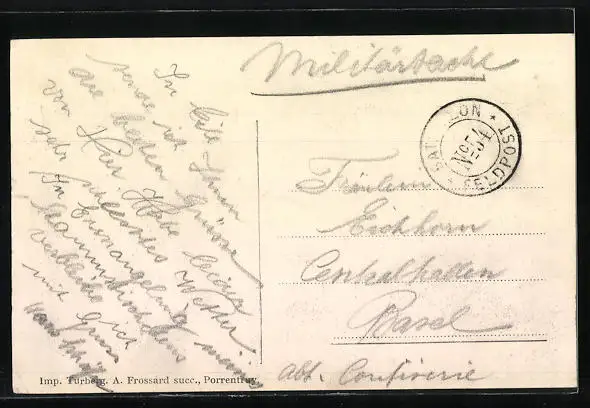 Personenbezogene Daten auf der Rückseite der Karte wurden durch blauen Textmarker unkenntlich gemacht. Die blauen Stellen sind auf die Vorderseite durchgeweicht und wirken sich negativ auf das Postkartenfoto aus