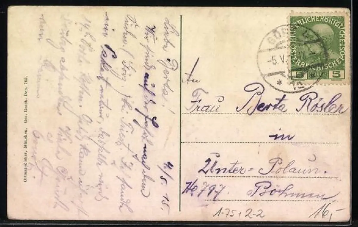 Personenbezogene Daten auf der Rückseite der Karte wurden durch blauen Textmarker unkenntlich gemacht. Die blauen Stellen sind auf die Vorderseite durchgeweicht und wirken sich negativ auf das Postkartenfoto aus
