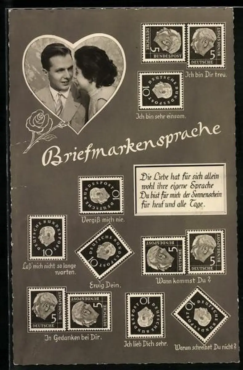 AK Briefmarkensprache, Rosenstrauss im Herz