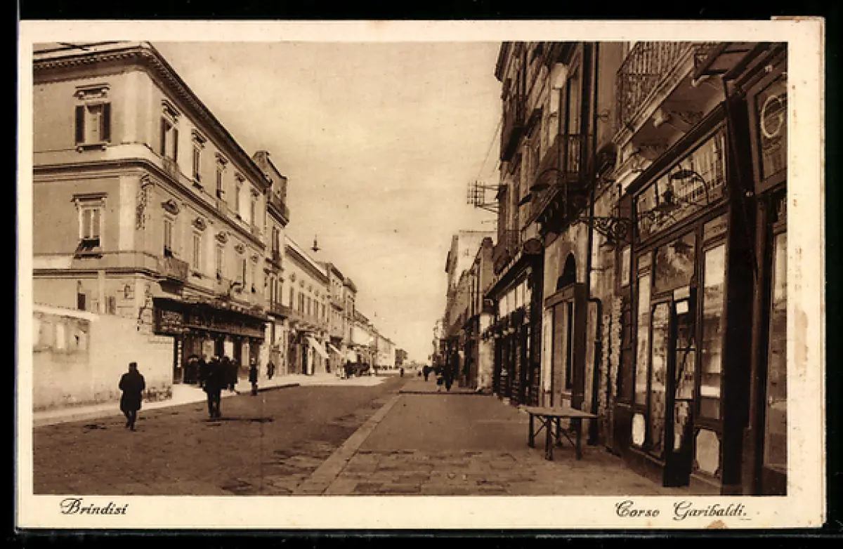 AK Brindisi, Corso Garibaldi con edifici storici e passanti
