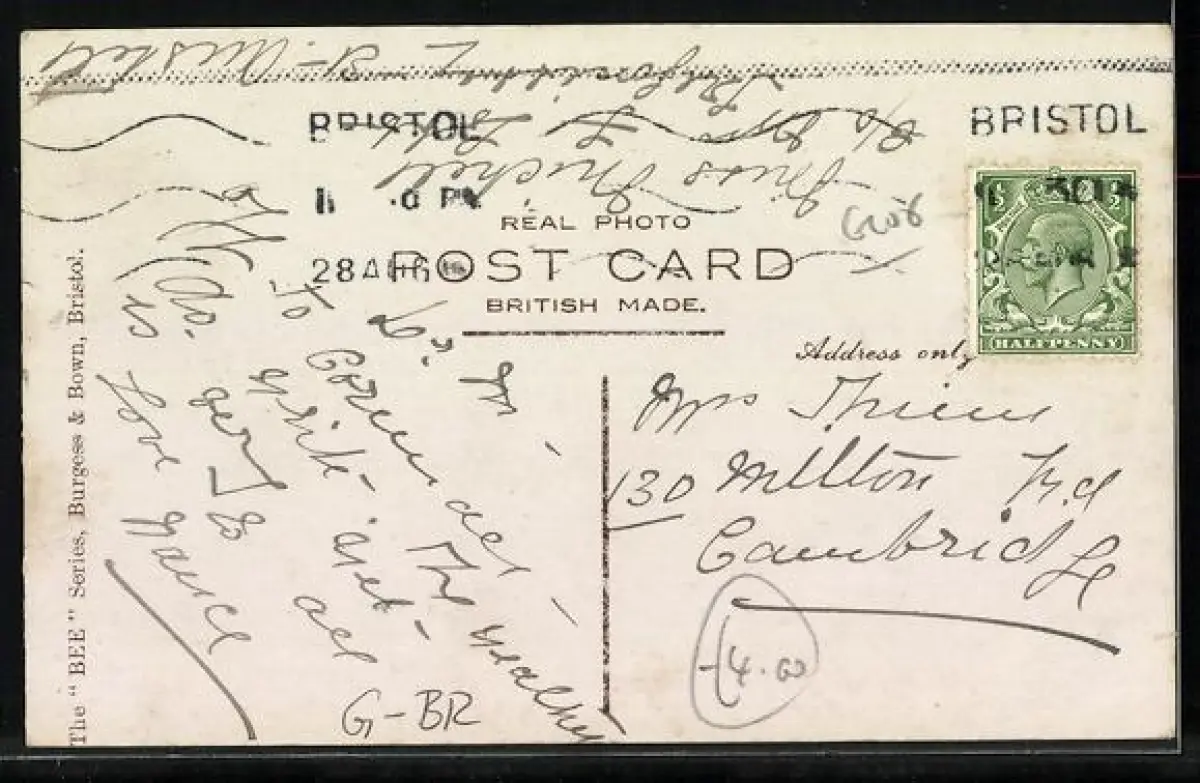 Personenbezogene Daten auf der Rückseite der Karte wurden durch blauen Textmarker unkenntlich gemacht. Die blauen Stellen sind auf die Vorderseite durchgeweicht und wirken sich negativ auf das Postkartenfoto aus