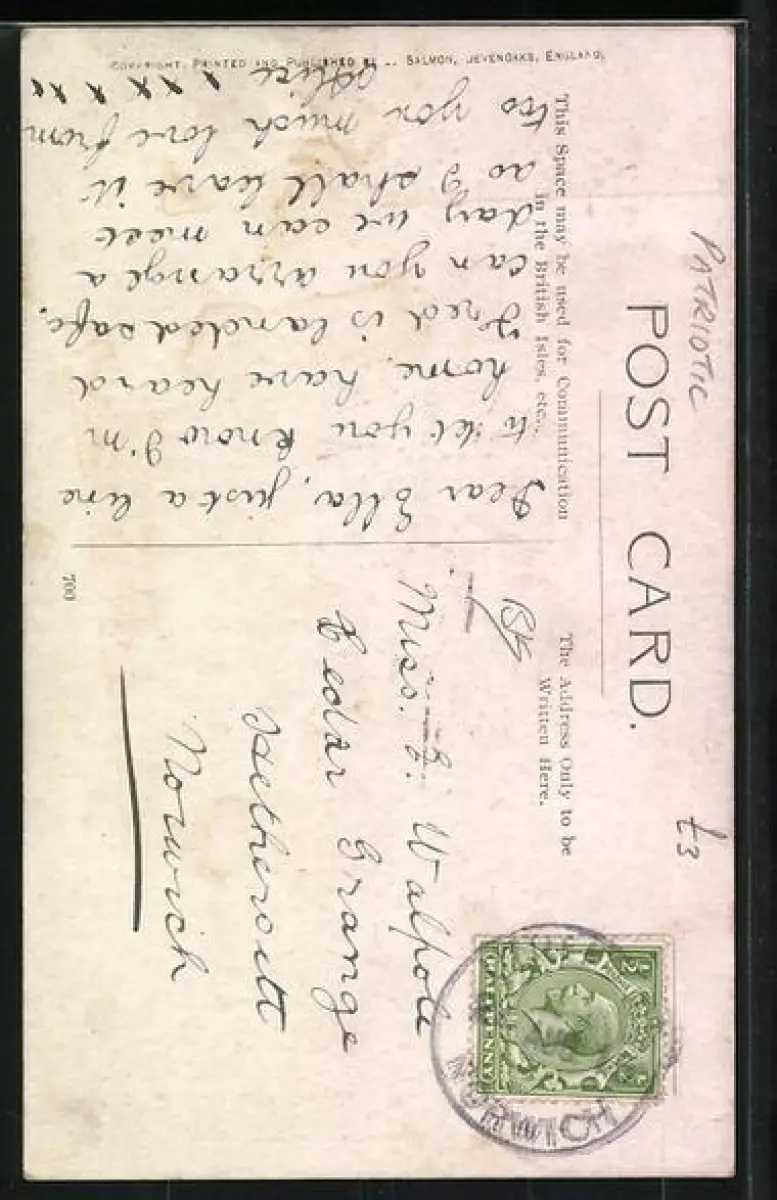 Personenbezogene Daten auf der Rückseite der Karte wurden durch blauen Textmarker unkenntlich gemacht. Die blauen Stellen sind auf die Vorderseite durchgeweicht und wirken sich negativ auf das Postkartenfoto aus