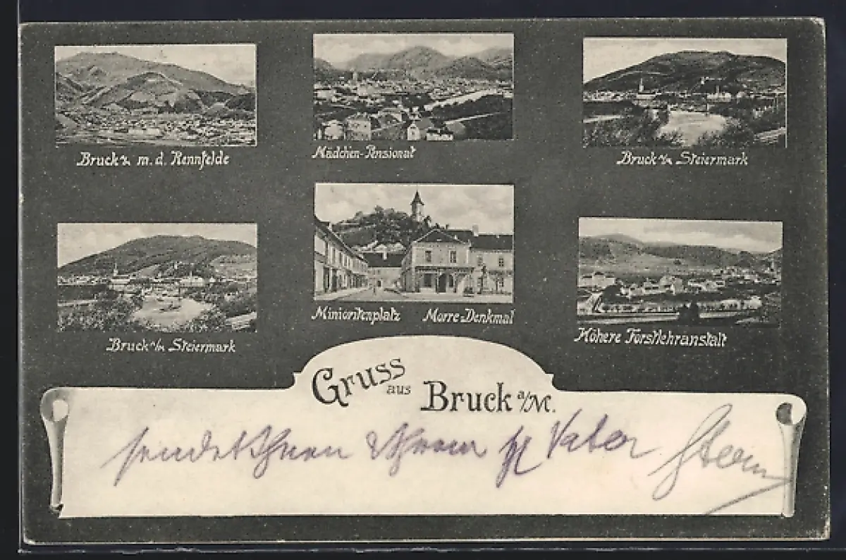 AK Bruck a. M., Rennfelde, Mädchen-Pensionat, Minoritenplatz und Höhere Forstlehranstalt