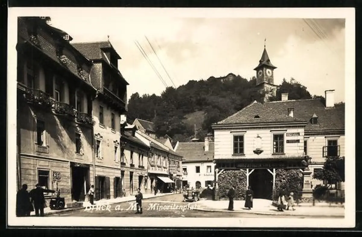 AK Bruck a. d. Mur, Monoritenplatz, Panorama mit Schlossberg