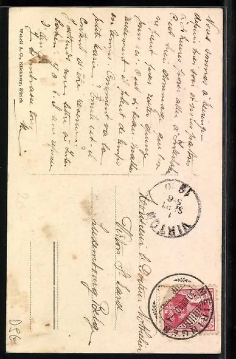 Personenbezogene Daten auf der Rückseite der Karte wurden durch blauen Textmarker unkenntlich gemacht. Die blauen Stellen sind auf die Vorderseite durchgeweicht und wirken sich negativ auf das Postkartenfoto aus