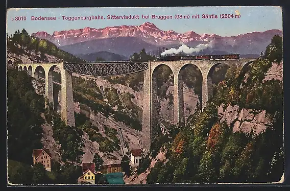 AK Bruggen, Bodensee-Toggenburgbahn auf Sitterviadukt mit Säntis