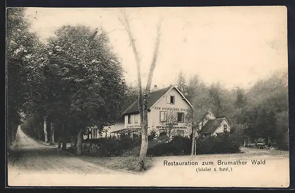 AK Brumath, Gasthaus Restauration zum Brumather Wald A. Distel mit Garten u. Strasse