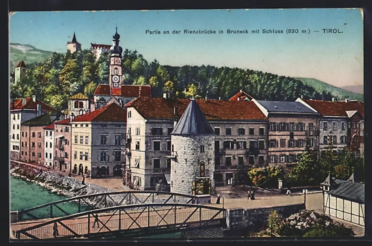 AK Bruneck, Partie an der Reinzbrücke mit Schloss, Gasthaus Zur Rose