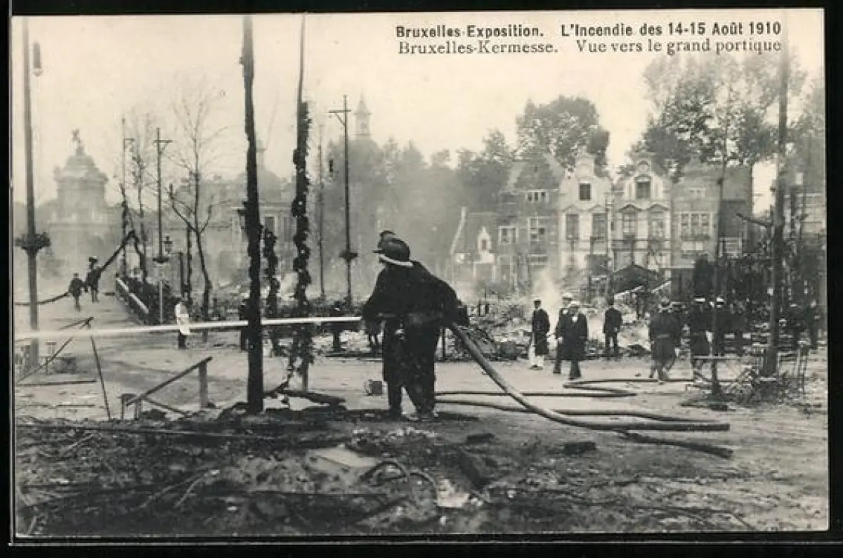 AK Bruxelles, Exposition, l'Incendie des 14-15 Aout 1910, vue vers le grand portique