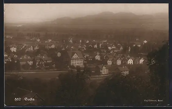 AK Buchs, Totalansicht mit Bergblick aus der Vogelschau