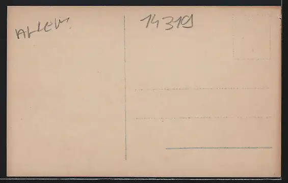 Personenbezogene Daten auf der Rückseite der Karte wurden durch blauen Textmarker unkenntlich gemacht. Die blauen Stellen sind auf die Vorderseite durchgeweicht und wirken sich negativ auf das Postkartenfoto aus