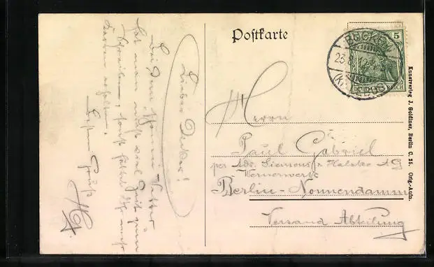 alte Ansichtskarte, gelaufen 1912, Stempelspur, mehrere Bugspuren mittig