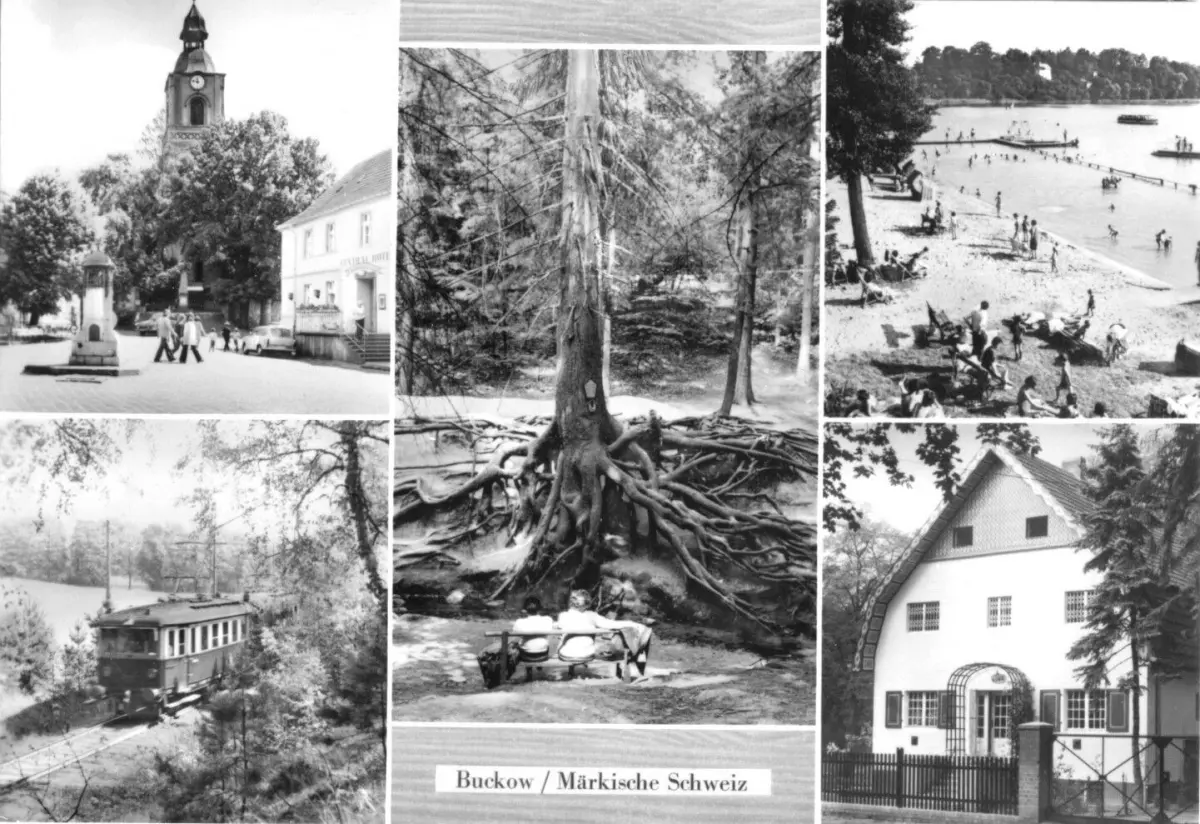 Ansichtskarte Buckow Märkische Schweiz fünf Abb. - Markt, Badeanstalt, Wurzelfichte, Waldbahn, Brecht-Weigel-Haus Erhaltung I ungelaufen Druckvermerk: 1978 Herstellungsland: DDR Verlag: Bild und Heimat, Reichenbach i. V. - 02 05 09 372