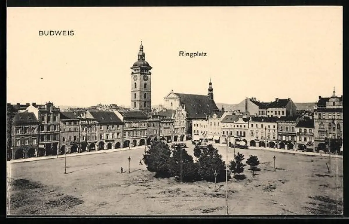 AK Budweis, Ansicht vom Ringplatz aus der Vogelschau