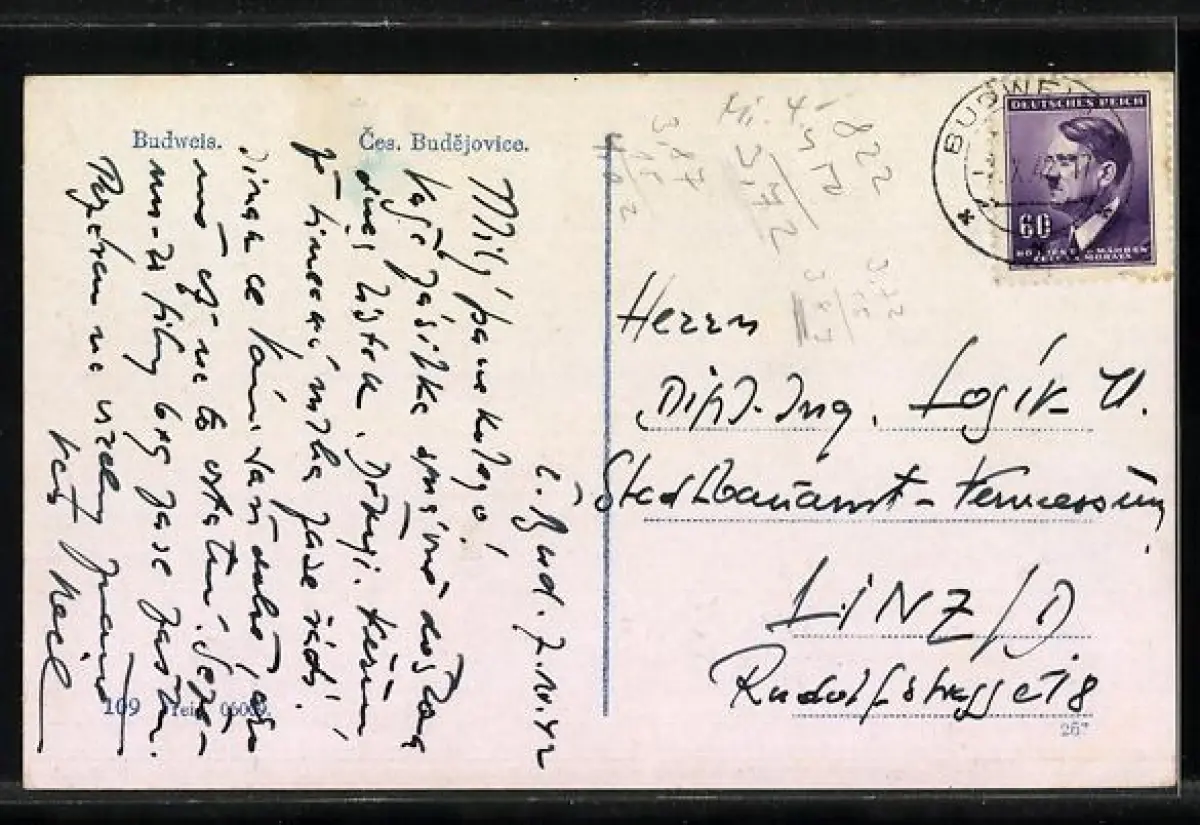 AK Budweis-Ceske Budejovice, Ortsansicht von oben