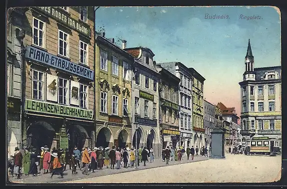 AK Budweis / Ceske Budejovice, Ringplatz mit Strassenbahn & Piano-Etablissement