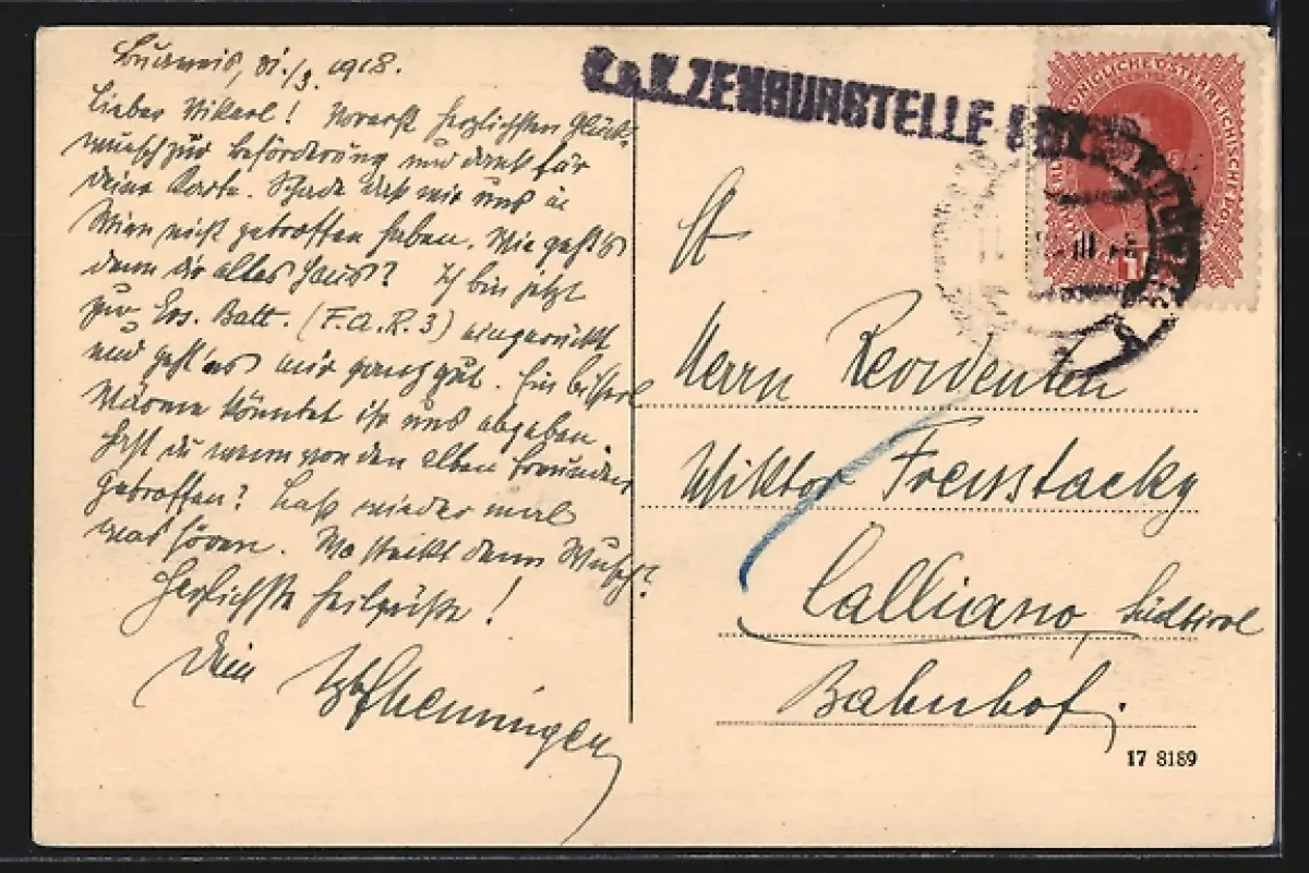 Personenbezogene Daten auf der Rückseite der Karte wurden durch blauen Textmarker unkenntlich gemacht. Die blauen Stellen sind auf die Vorderseite durchgeweicht und wirken sich negativ auf das Postkartenfoto aus