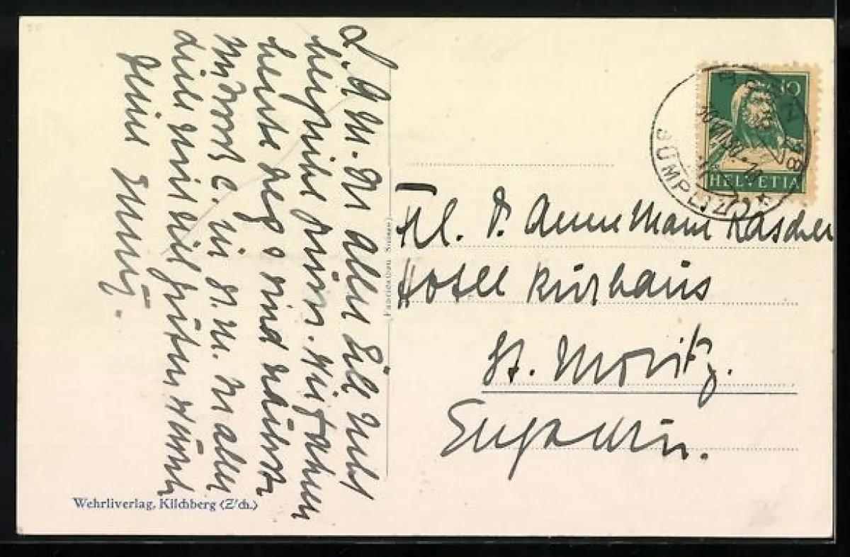 Personenbezogene Daten auf der Rückseite der Karte wurden durch blauen Textmarker unkenntlich gemacht. Die blauen Stellen sind auf die Vorderseite durchgeweicht und wirken sich negativ auf das Postkartenfoto aus