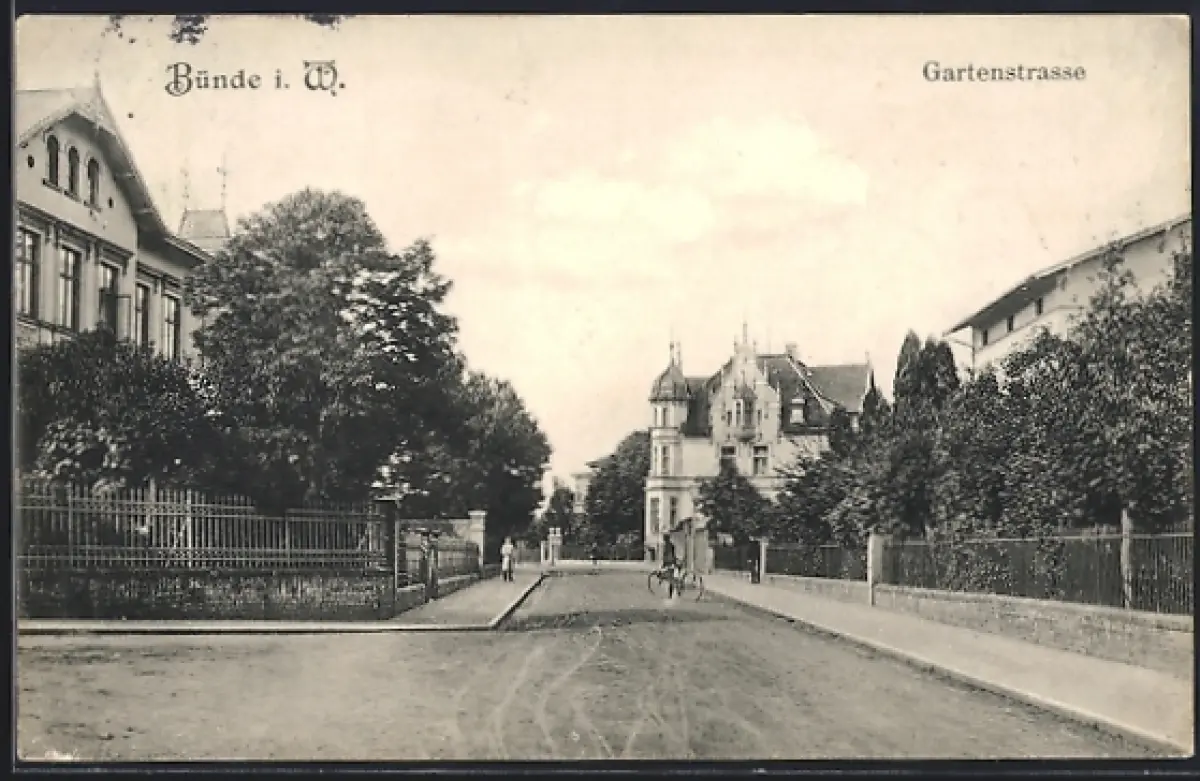 AK Bünde i. W., Gartenstrasse mit Fahrradfahrer