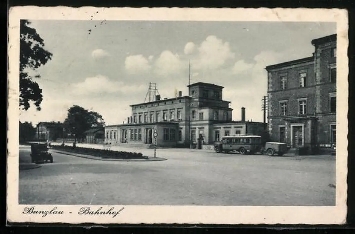 AK Bunzlau, Blick auf den Bahnhof, Postbus mit Anhänger