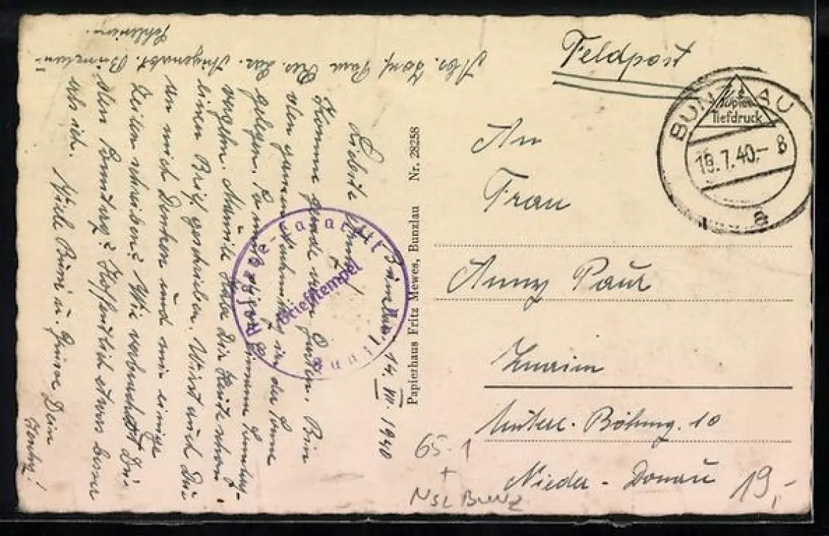 gelaufen 1940, Eckknick rechts oben, guter Zustand