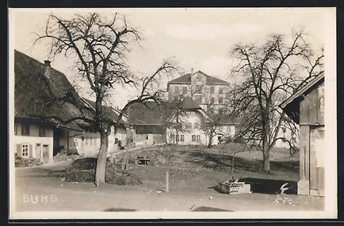 AK Burg, Ortspartie mit erhöhtem Gebäude, Panorama