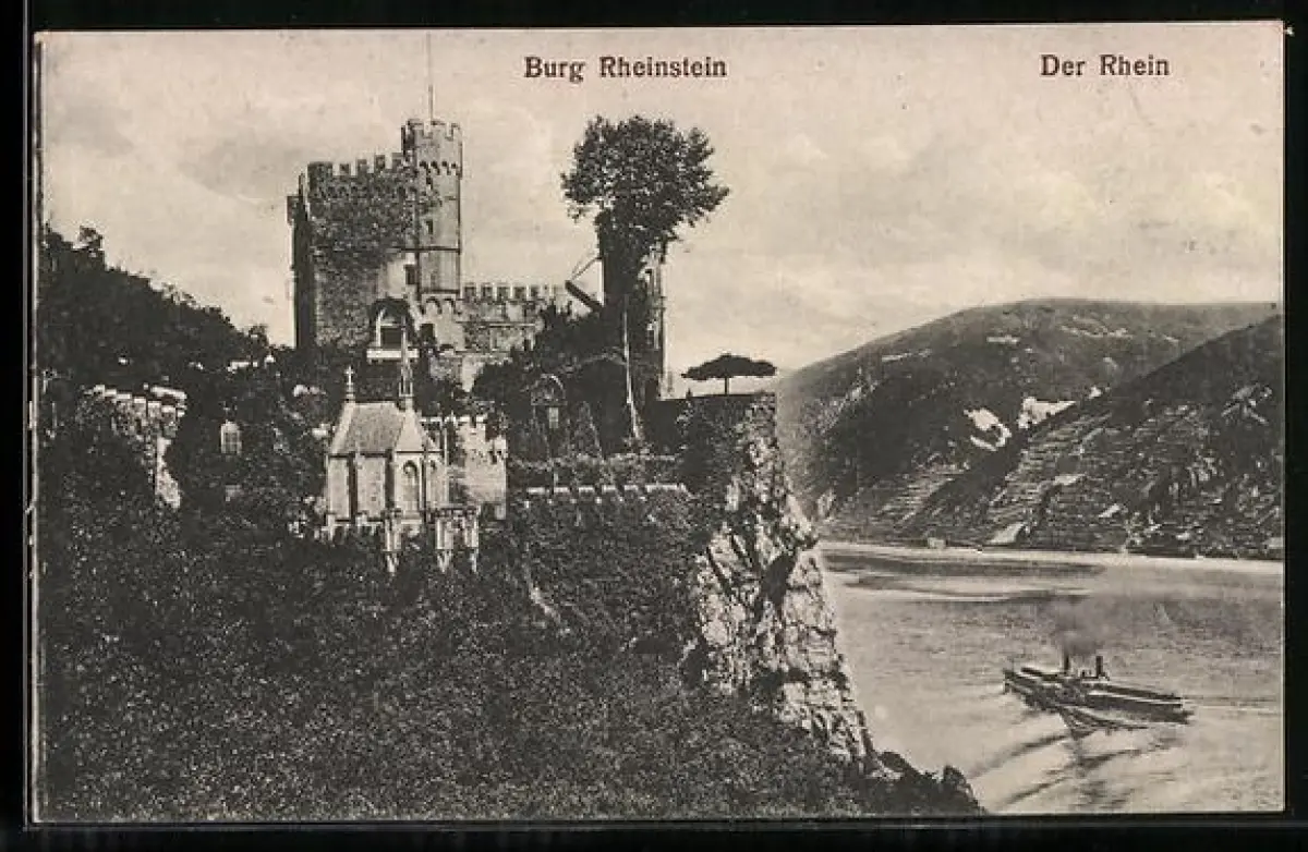 AK Burg Rheinstein, Burg mit Rheinpartie und Dampfer