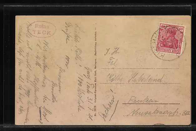 Personenbezogene Daten auf der Rückseite der Karte wurden durch blauen Textmarker unkenntlich gemacht. Die blauen Stellen sind auf die Vorderseite durchgeweicht und wirken sich negativ auf das Postkartenfoto aus