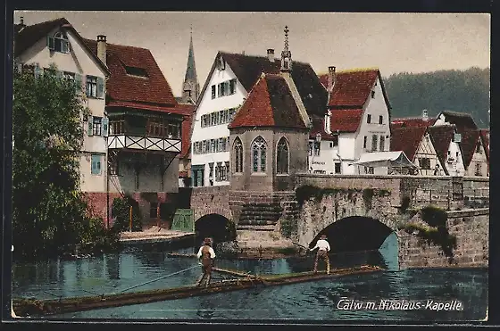 AK Calw, Alte Flussbrücke mit Nikolaus-Kapelle, langes Holzfloss