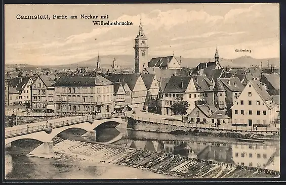 AK Cannstatt, Partie am Neckar mit Wilhelmsbrücke und Württemberg