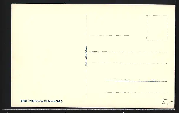 Personenbezogene Daten auf der Rückseite der Karte wurden durch blauen Textmarker unkenntlich gemacht. Die blauen Stellen sind auf die Vorderseite durchgeweicht und wirken sich negativ auf das Postkartenfoto aus