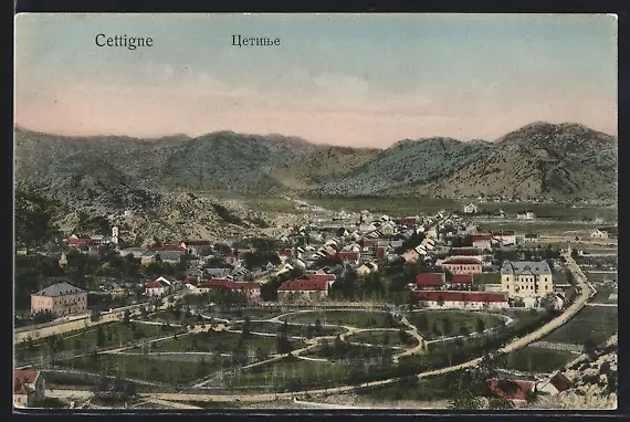 AK Cettigne, Ortsansicht mit einer Parkanlage