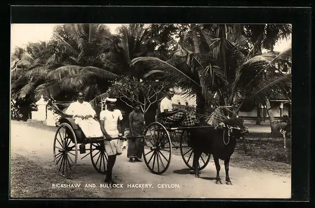 AK Ceylon, Rikscha neben Ochsen-Gespann auf einer Strasse
