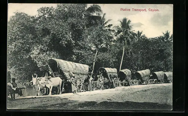 AK Ceylon, Rinder-Gespann vor einer Reihe von Wagen